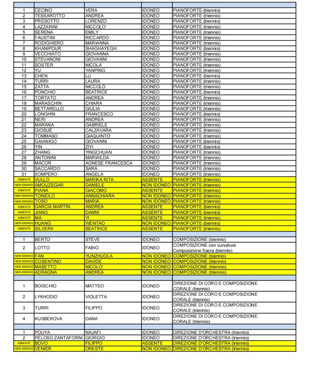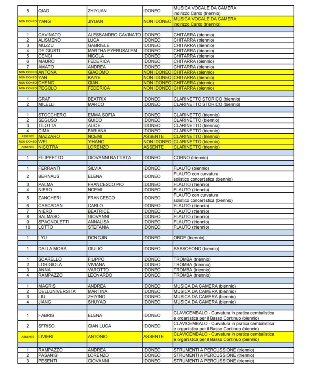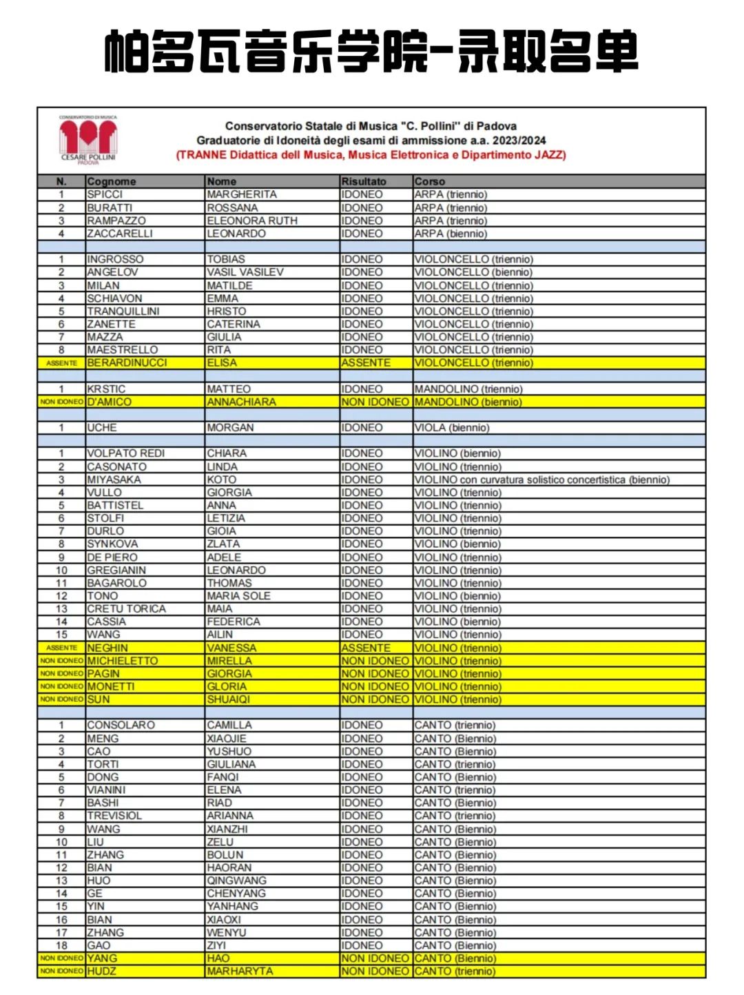 > 2023/2024帕多瓦音乐学院-录取名单
